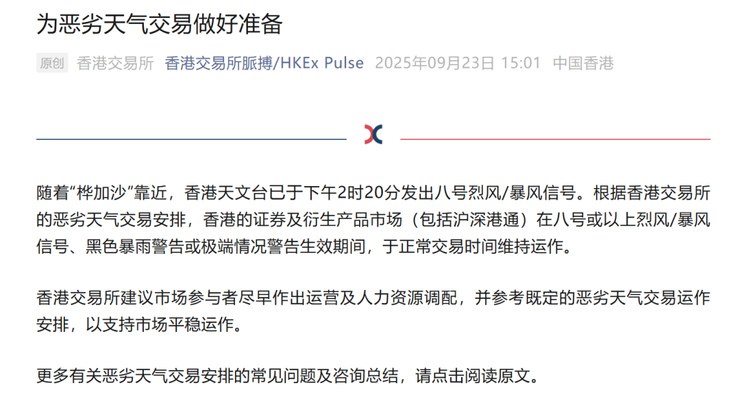 香港天文台于9月23日下午2时20分发出八号热带气旋警告信号。同日午后,港交所发文表示,根据香港交易所的恶劣天气交易安排,香港的证券及衍生产品市场(包括沪深港通)在八号或以上烈风/暴风信号、黑色暴雨警告或极端情况警告生效期间,于正常交易时间维持运作。香港交易所建议市场参与者尽早作出运营及人力资源调配,并参考既定的恶劣天气交易运作安排,以支持市场平稳运作。