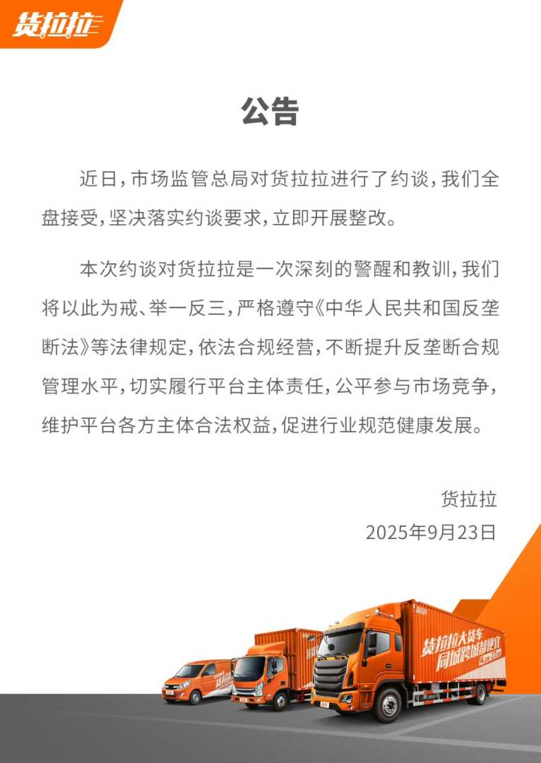 9月23日晚间,货拉拉官方微博发布公告称接受市场监管总局约谈,将立即开展整改,严格遵守反垄断法等法律规定,依法合规经营,维护平台各方主体合法权益。