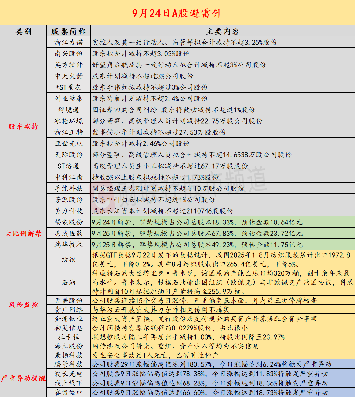 9月24日投资避雷针:A股海外风险事件全梳理,纺织服装出口波动引关注