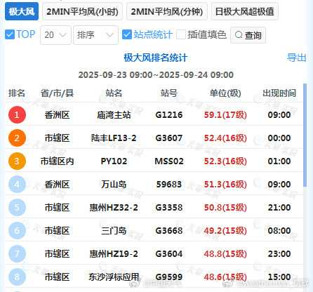 9月24日早晨,超强台风桦加沙从珠江口南侧经过,广东多地阵风超12级,珠海香洲区监测到17级阵风。随着冷空气南下,台风强度或减弱,路径西移,广东沿海需继续防范强风雨。