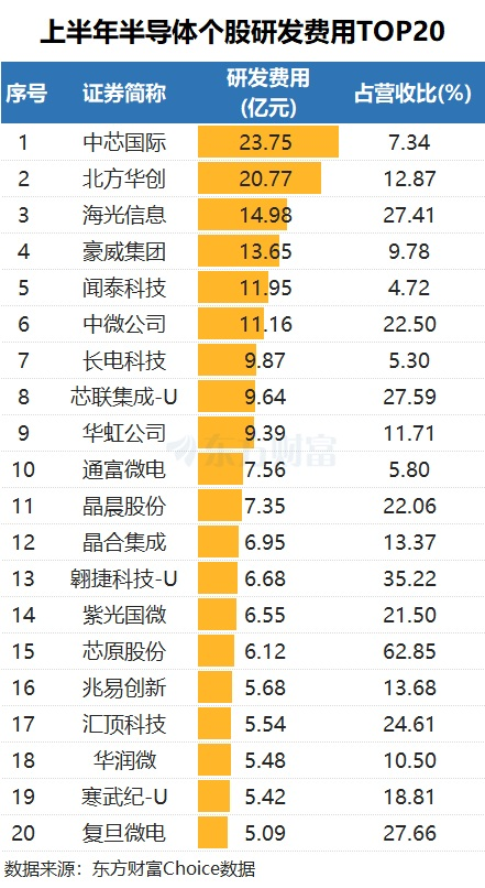 而从绝对值来看,中芯国际是上半年半导体个股中研发费用最多个股,达23.75亿元,占当期营收的7.34%。北方华创紧随其后,研发费用20.77亿元,占营收比为12.87%。海光信息、豪威集团、闻泰科技、中微公司上半年研发费用也超过10亿元。