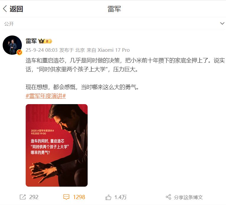 9月24日上午,小米集团董事长兼CEO雷军在微博发文称,造车和重启造芯(小米芯片)几乎是同时做的决策,把小米前十年攒下的家底全押上了。说实话,“同时供家里两个孩子上大学”,压力巨大。现在想想都会感慨,当时哪来这么大的勇气。(小米决策)