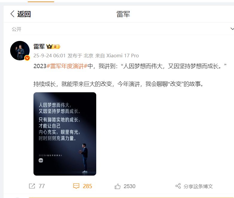 在微博中,雷军还不忘为年度演讲造势。在三小时内他连续发了3条微博,除了记录健身房今年第99次打卡,他还透露,今年演讲将聊聊“改变”的故事。2023年雷军演讲中讲到:“人因梦想而伟大,又因坚持梦想而成长。”持续成长就能带来巨大改变。(小米成长)