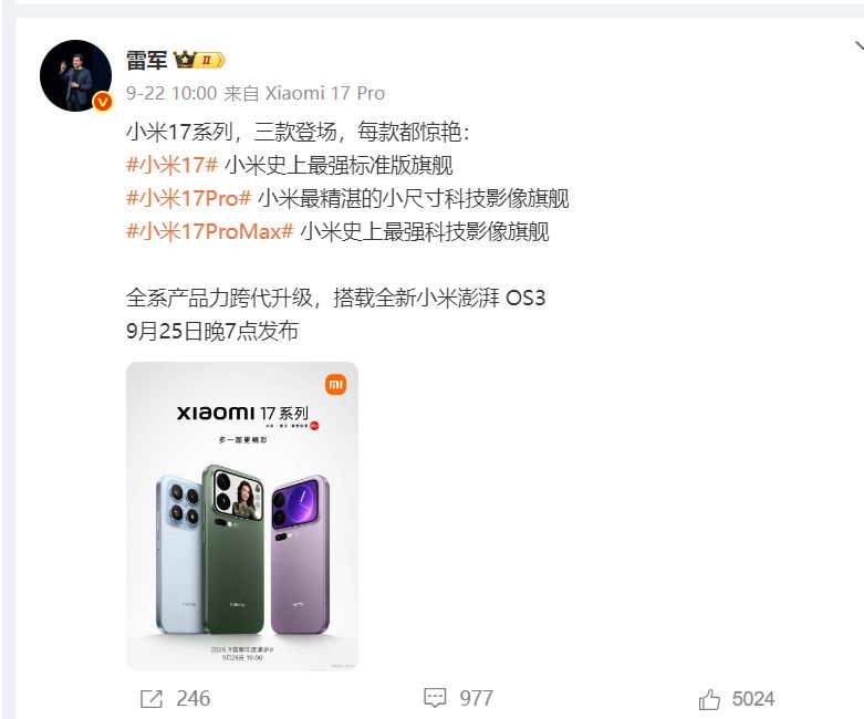 9月22日,雷军通过微博官宣,将于9月25日晚7点发布,涉及三款机型:小米17、小米17 Pro、小米17 Pro Max。发布会当晚将举办第六次年度演讲,主题为《改变》,届时将分享小米玄戒芯片和小米汽车的相关故事。(小米发布会)