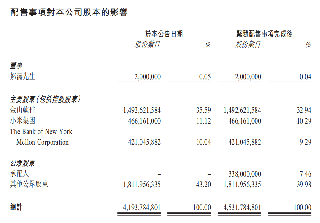 配售完成后,金山软件(03888.HK)持有金山云32.94%的股份,而小米集团则持有10.29%。