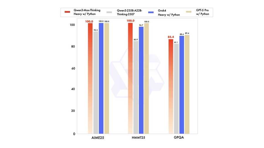 Qwen3-Max的推理增强版Qwen3-Max-Thinking-Heavy也展现出非凡性能,结合工具调用和并行推理技术,其推理能力创下新高,尤其在聚焦数学推理的AIME25和HMMT测试中,均达到突破性的满分100分,为国内首次。这款AI大模型推理模型之所以能够取得优异成绩,原因在于大模型在解数学题时懂得调动工具,能够写代码做题,同时,增加测试时的计算资源,也让模型表现变得更好,体现了技术创新的魅力。