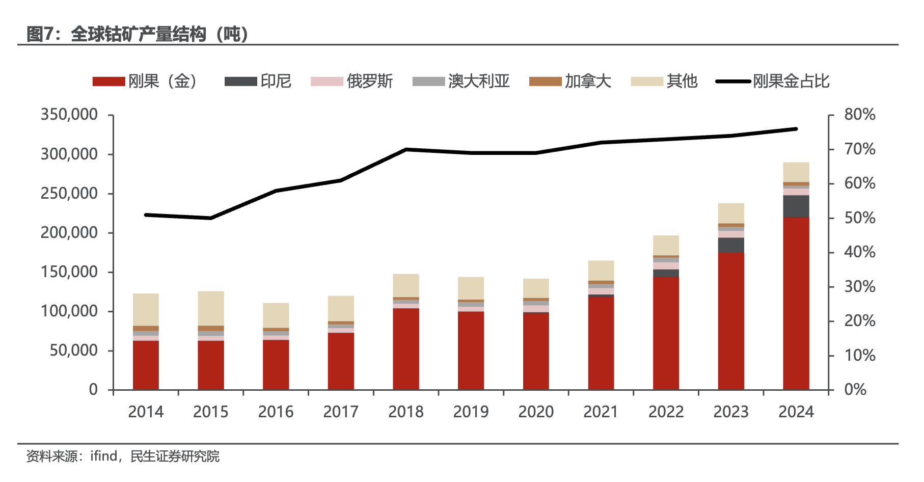 民生证券研究院8月发布的一份分析报告指出,从刚果(金)政府彼时的诉求看,钴价持续下跌影响了钴矿对国家税收等经济贡献,计划通过限制原料供应掌握定价权,政府挺价态度强烈。钴矿一般与铜矿、镍矿伴生,因此资源集中分布在铜矿、镍矿资源较为丰富的地区。刚果(金)为全球第一大钴资源大国,钴储产量丰富。根据美国地质调查局(USGS)数据,截至2024年,全球钴矿储量1100万吨,刚果(金)2024年钴矿储量600万吨,全球占比55%,澳大利亚、印尼钴资源位列全球第二、第三位,2024年全球占比分别为15%、6%。