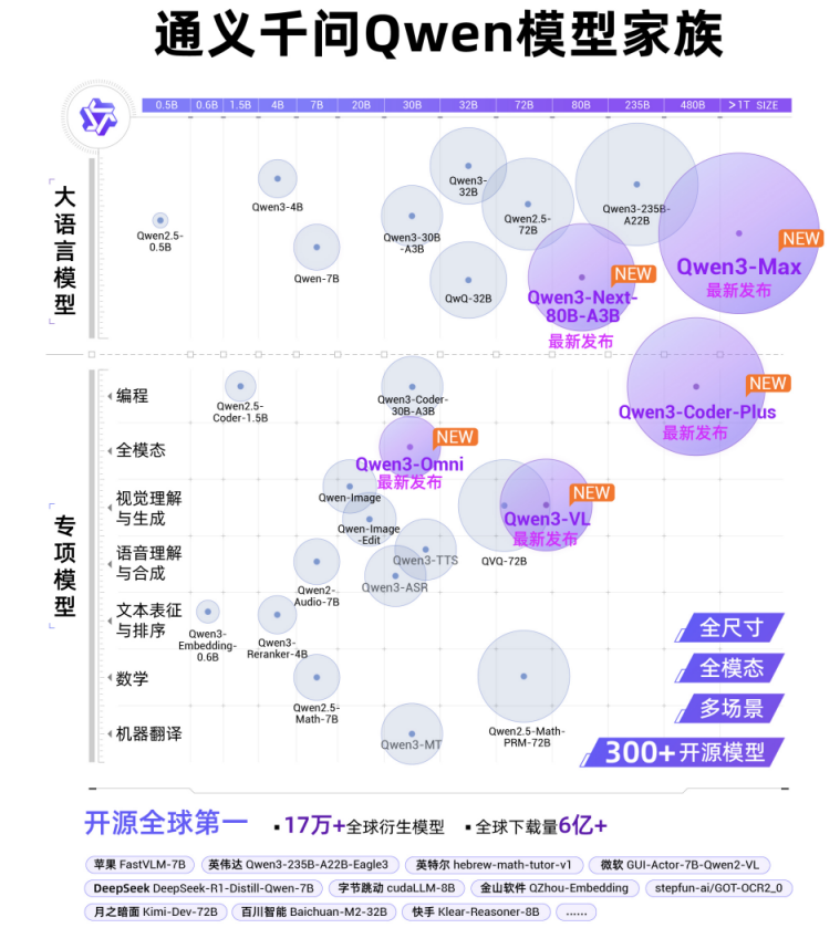 截至目前,阿里通义开源300余个模型,覆盖不同大小的“全尺寸”及LLM、编程、图像、语音、视频等“全模态”,全球下载量突破6亿次,全球衍生模型17万个,稳居全球第一,彰显中国科技实力。