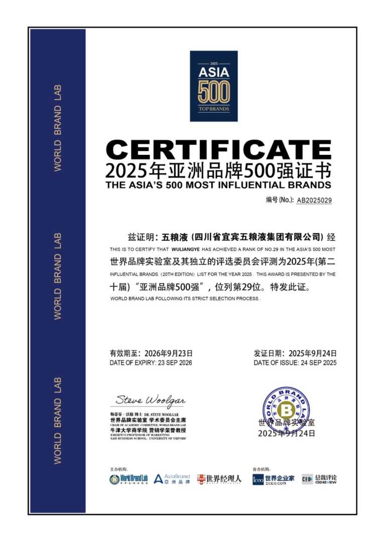 五粮液荣登《亚洲品牌500强》第29位,品牌实力彰显
