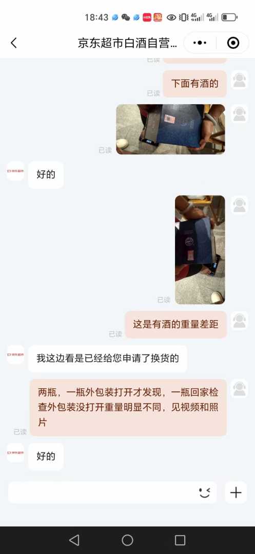 “我买了几十年酒第一次遇到这种情况。”刘女士随后将问题反映给平台客服。但售后过程并不顺利。她称与客服聊三天,但客服多次回复滞后,且最终仅同意退回未开封的空瓶酒,而开封后的“空瓶”则不在退赔范围。这一处理结果令她无法接受,并向消协和媒体进一步投诉。消费者在遇到问题时,应积极维权。
