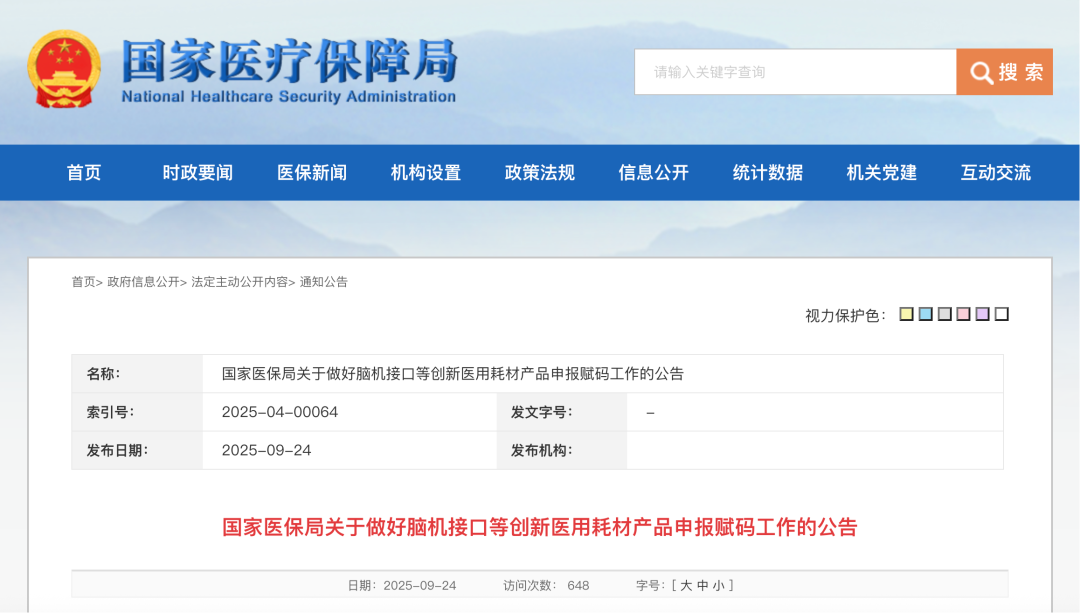 9月24日,国家医保局发布关于做好脑机接口等创新医用耗材产品申报赋码工作的公告。
