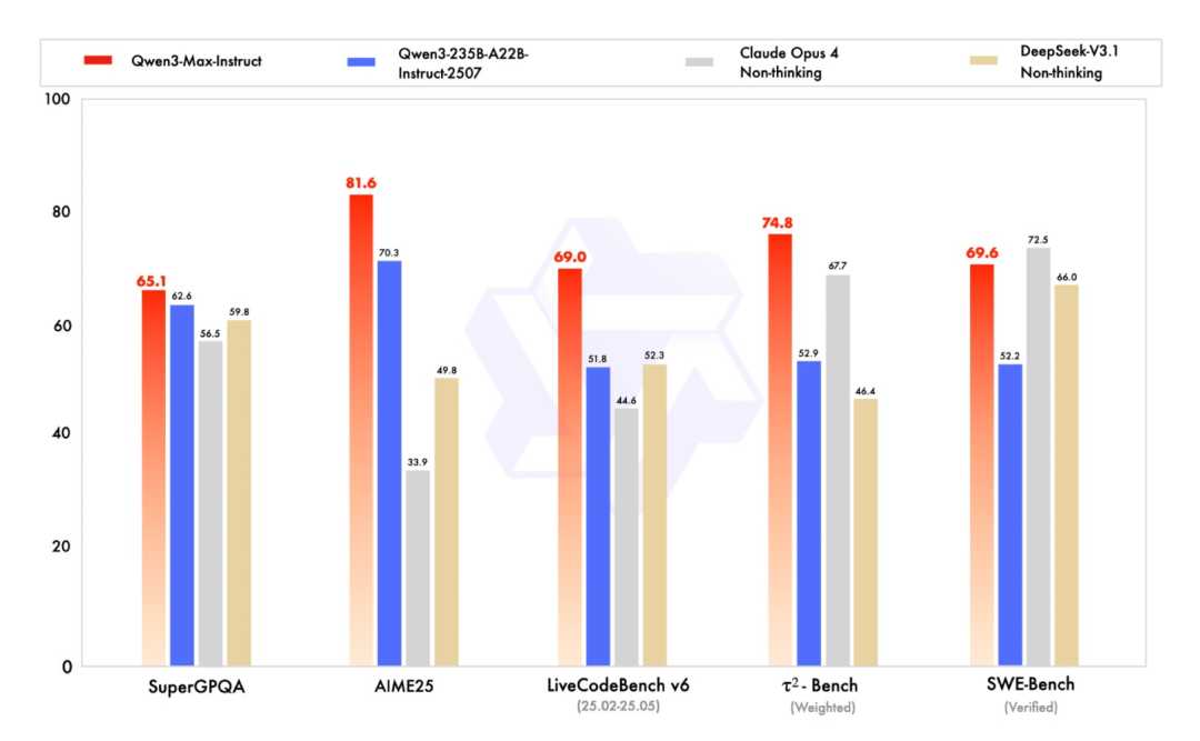 在产品发布层面,阿里云CTO周靖人宣布了最新的模型进展,一口气推出7款大模型,覆盖语言、视觉、语音、代码等多个方向。其中,基础模型 Qwen3-Max 是通义千问迄今规模最大的模型,预训练数据量高达36万亿tokens,总参数规模超过万亿。在聚焦Agent工具调用能力的Tau2-Bench测试中,该模型取得74.8分,超过Claude Opus4和Deepseek-V3.1,展现了强大的技术实力。