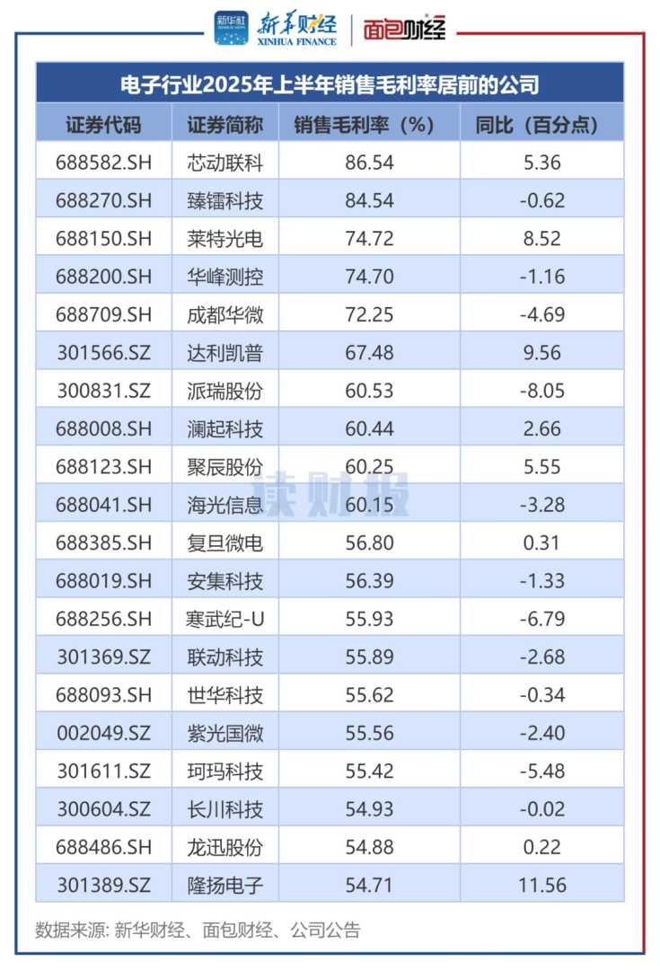 2025年上半年,A股电子行业公司平均销售毛利率为25.71%,同比下降0.37个百分点。具体来看,芯动联科上半年销售毛利率位居第一,达86.54%,同比上涨5.36个百分点;臻镭科技、莱特光电等4家公司销售毛利率涨幅均超过70%;华映科技、沪硅产业等6家公司的销售毛利率为负。增速方面,合力泰、南极光、和辉光电等公司销售毛利率同比涨幅较大。