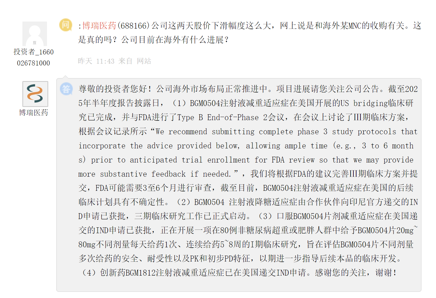 在上证e互动平台,有投资者提问博瑞医药股价大跌是否与海外MNC收购有关,对此,博瑞医药并未做出正面回答,只是就目前其核心管线BGM0504注射液 (GLP-1/GIP双靶点)和口服片剂在国外的临床进展进行了回应,并披露旗下长效Amylin类似物BGM1812针对减重的适应症已在美国递交IND申请,凸显GLP-1研发热度。