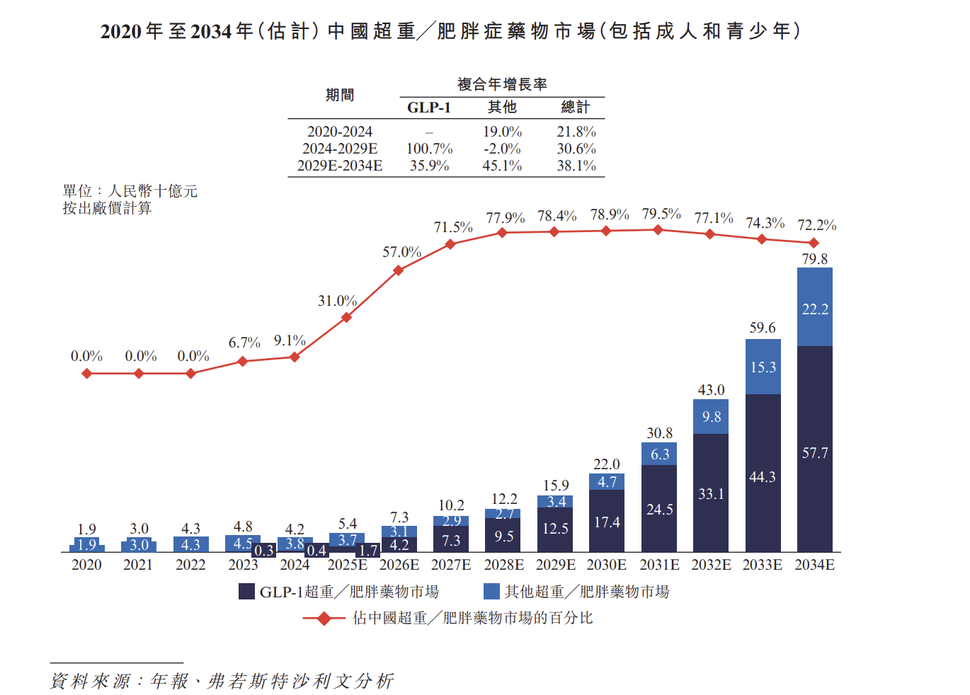 根据弗若斯特沙利文分析数据,2024年中国超重/肥胖药物市场规模为2亿元,预计2029年将达到159亿元。其中,GLP-1药物用于减肥适应症的市场规模预计2029年将达到125亿元,市场份额也将同步上升至78.4%,减肥药市场前景广阔。