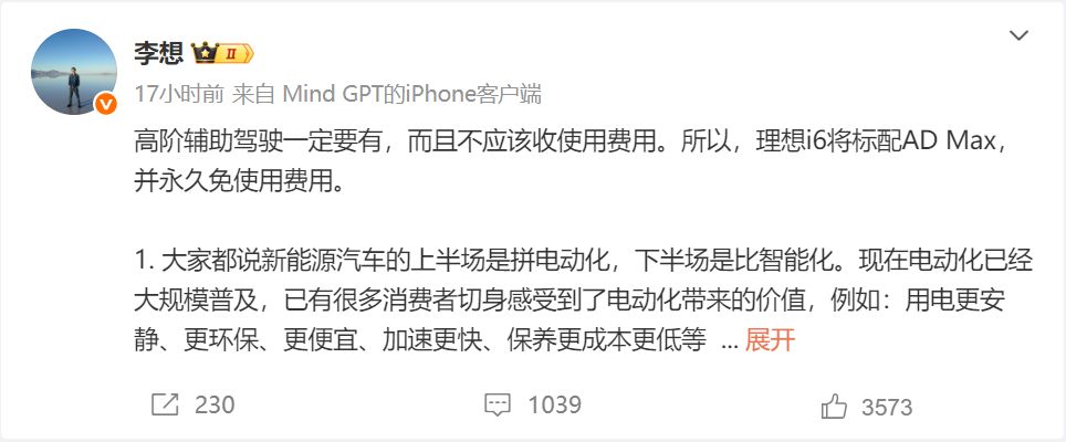 李想认为,新能源汽车竞争已进入以智能化为关键的下半场,而高阶辅助驾驶是现阶段智能化的核心价值点。他指出,当前行业中存在的高阶辅助驾驶功能收费模式,且价格不菲,在一定程度上限制了用户对智能化便利的充分体验。理想汽车此举旨在让更多消费者能够无障碍地体验来自中国的人工智能技术。