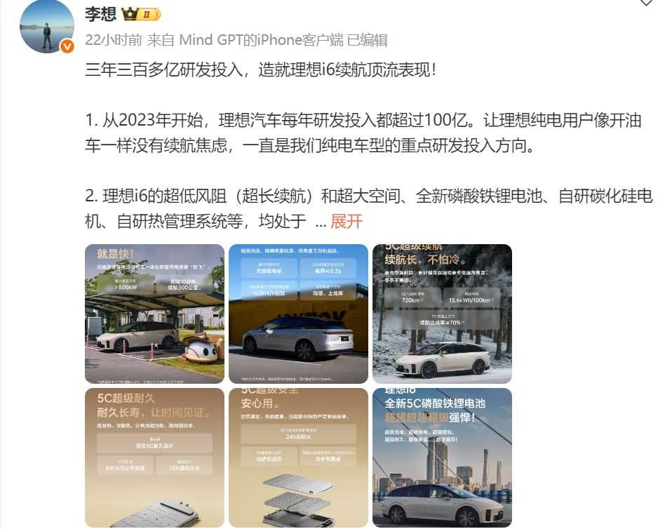 “三年三百多亿元研发投入,造就理想i6续航顶流表现!”李想还表示,“从2023年开始,理想汽车每年研发投入都超过100亿元。让理想纯电用户像开油车一样没有续航焦虑,一直是我们纯电车型的重点研发投入方向。”
