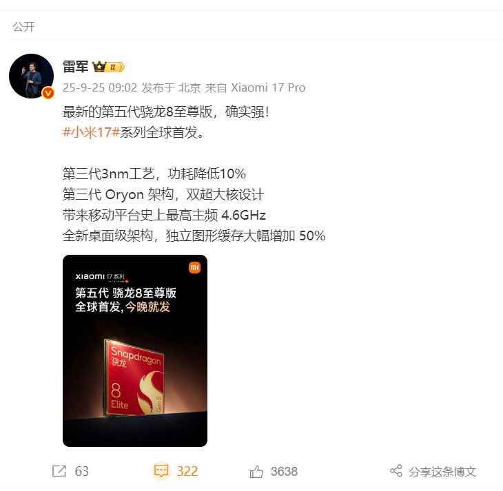 9月25日早间,小米澎湃OS官方微博正式宣布,小米17系列将于9月25日晚7点全球首发第五代骁龙8至尊版处理器。这款采用第三代3nm工艺的芯片,在功耗表现上相比前代有显著提升,为移动平台带来史上最高主频4.6GHz,成为手机芯片领域的重大突破。
