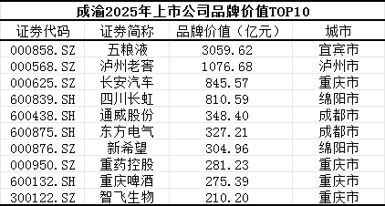 基于总榜TOP3000,记者统计出成渝地区品牌价值排名前十的企业。其中,两家知名白酒品牌上市公司位居前二,即五粮液(000858.SZ)和泸州老窖(000568.SZ),品牌价值分别达到3059.62亿元和1076.68亿元,长安汽车(000625.SZ)位居第三,其品牌价值略高于四川长虹(600839.SH)。