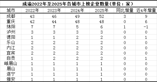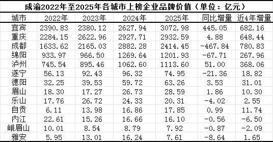从城市角度来看,宜宾、重庆和成都的上榜企业合计品牌价值位居前三。从近四年增量数据来看,成都在两大核心指标上均拔得头筹:不仅上榜企业合计品牌价值增量最高,上榜企业数量增量同样位居第一。
