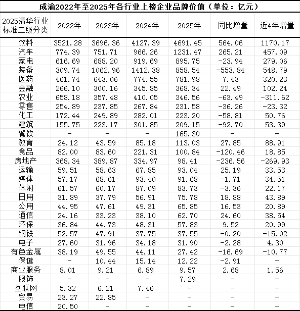 受益于成熟的白酒产业,饮料行业不仅稳居成渝城市群品牌价值首位,近四年增量更达1170.17亿元,位列各行业第一;汽车行业在2025年品牌价值突破千亿元,达到1231.47亿元。不过,农业品牌价值出现明显下滑,这主要是因为通威股份(600438.SH)主营业务从农业转向装备领域。