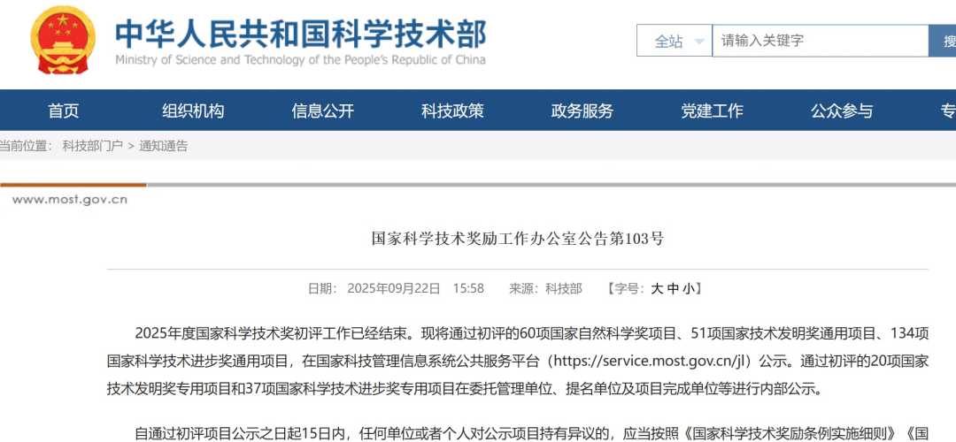2025年度国家科学技术奖初评工作于日前结束,国家科学技术奖励工作办公室对初评的60项国家自然科学奖项目、51项国家技术发明奖通用项目、134项国家科学技术进步奖通用项目,在国家科技管理信息系统公共服务平台进行公示;对通过初评的20项国家技术发明奖专用项目和37项国家科学技术进步奖专用项目在委托管理单位、提名单位及项目完成单位等进行内部公示。科技创新奖励公示,彰显国家科研实力。