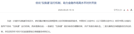 具体措施包括建立“互换通”报价商动态调整机制,并扩充报价商队伍。完善每日净限额动态评估机制,并自2025年10月13日起提高每日净限额至450亿元,这一调整将有效促进市场交易活跃度。