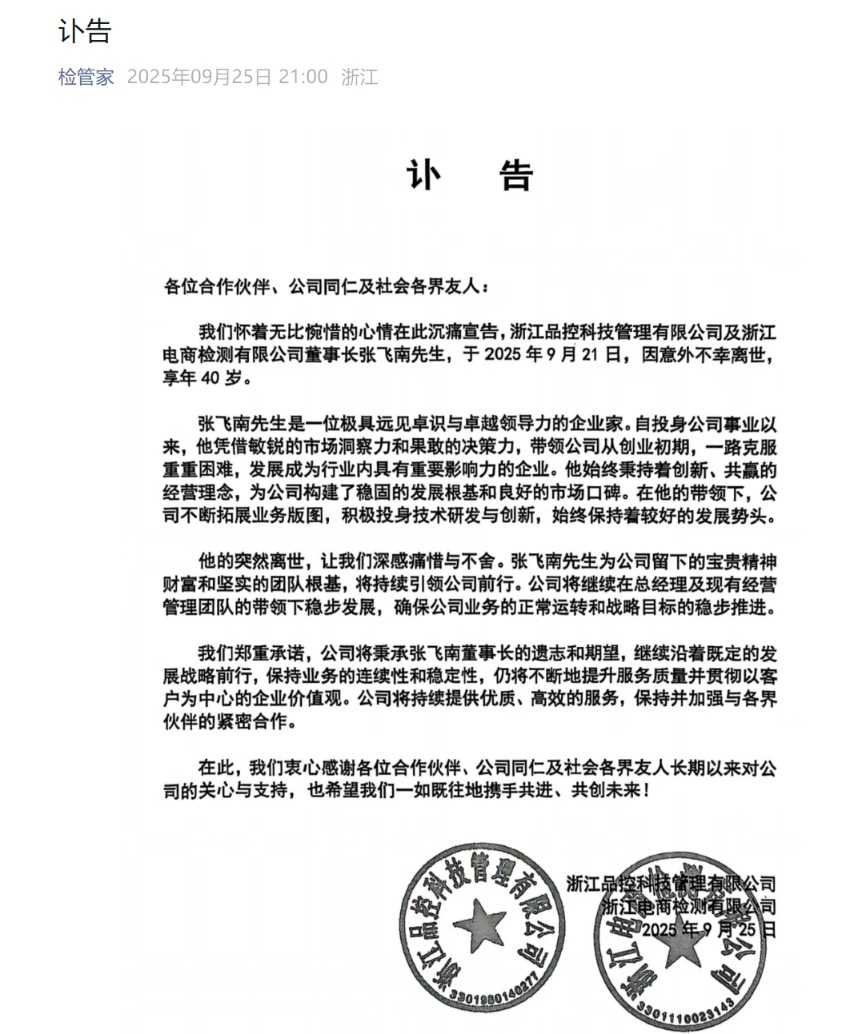 9月25日晚间,浙江品控科技管理有限公司(以下简称品控科技)旗下“检管家”微信公众号发布讣告,宣布公司及浙江电商检测有限公司董事长张飞南于2025年9月21日因意外离世,享年40岁。这位科技行业的领军人物,其离世无疑给行业带来巨大损失。