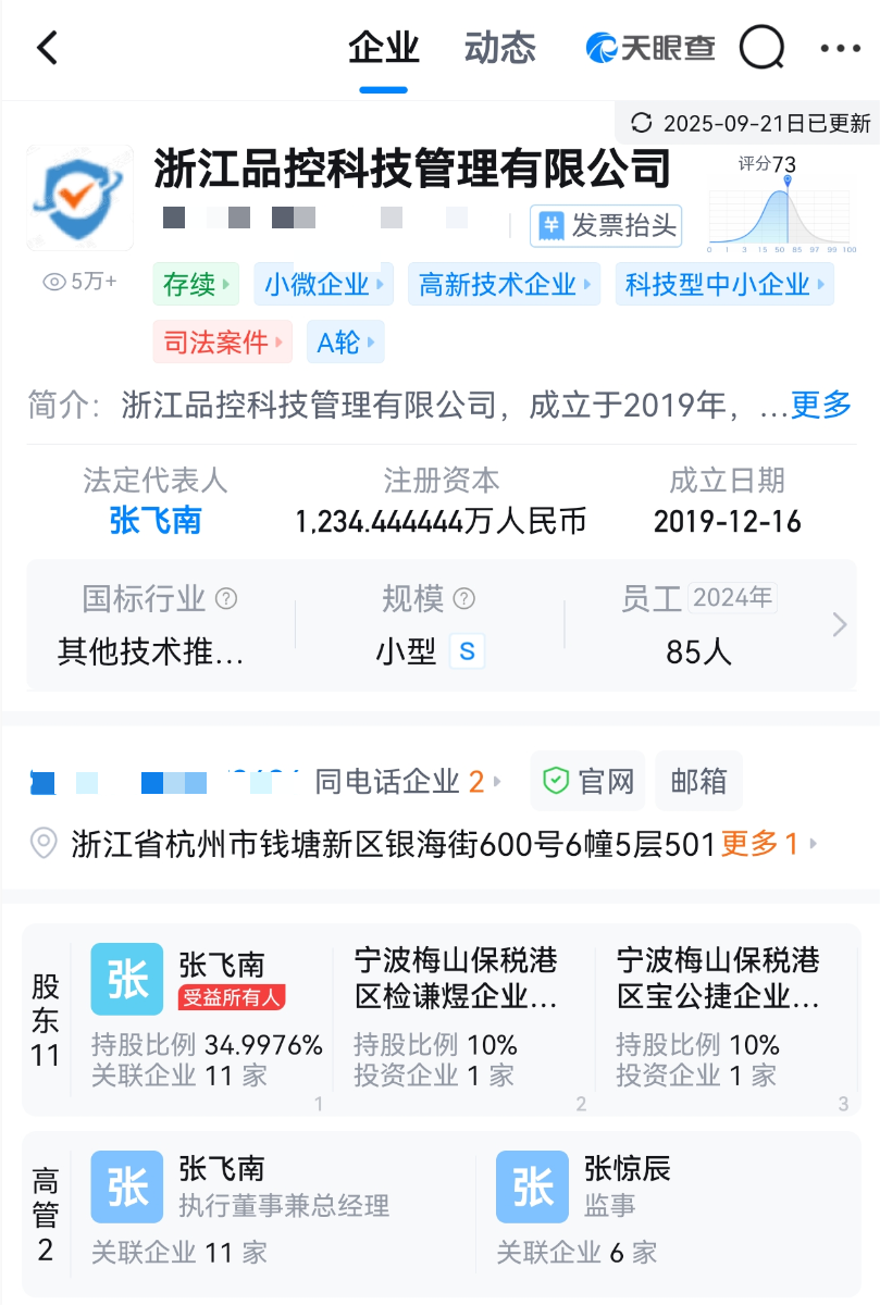 天眼查信息显示,品控科技成立于2019年,注册资本为1234.44万元,发展势头强劲。股东信息方面,张飞南直接持有品控科技约35%的股权,是公司的重要股东。