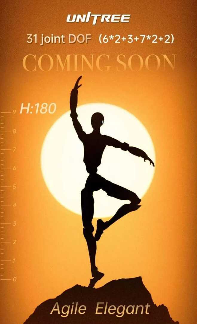今年8月19日,宇树科技曾发布新款人形机器人预告海报,配文“敬请期待”。根据官方海报,新款人形机器人身高1.8米,将配备31个关节,这意味着机器人或具有更好的灵活性和动作精准度,为机器人应用拓展了新空间。