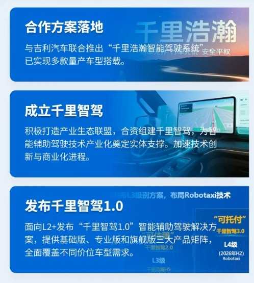 2025年3月,千里科技发布公告称,拟与两江产业基金、重庆产业母基金、江河汇、吉利、重庆迈驰、路特斯等签署《车BU投资框架协议》,共同出资15亿元设立一家从事智能辅助驾驶业务的公司“千里智驾”,定位为“独立的智能汽车解决方案供应商”,希望再造一个“华为车BU(引望)”。随后,吉利与千里科技联合发布“千里浩瀚”智驾系统,结束了吉利旗下品牌智驾各自为战的局面。