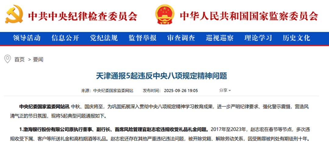 9月26日,天津通报5起违反中央八项规定精神问题。其中,首个典型问题即为“渤海银行股份有限公司原执行董事、副行长、首席风险管理官赵志宏违规收受礼品礼金问题”。据通报,2017年至2023年,赵志宏在春节等节点,多次违规收受下属、客户等所送礼金和高档烟酒等礼品。赵志宏还存在其他严重违纪违法问题,被开除党籍、解除劳动关系,因受贿罪被判处有期徒刑十年。值得一提的是,这是官方首次通报赵志宏被处理的消息。
