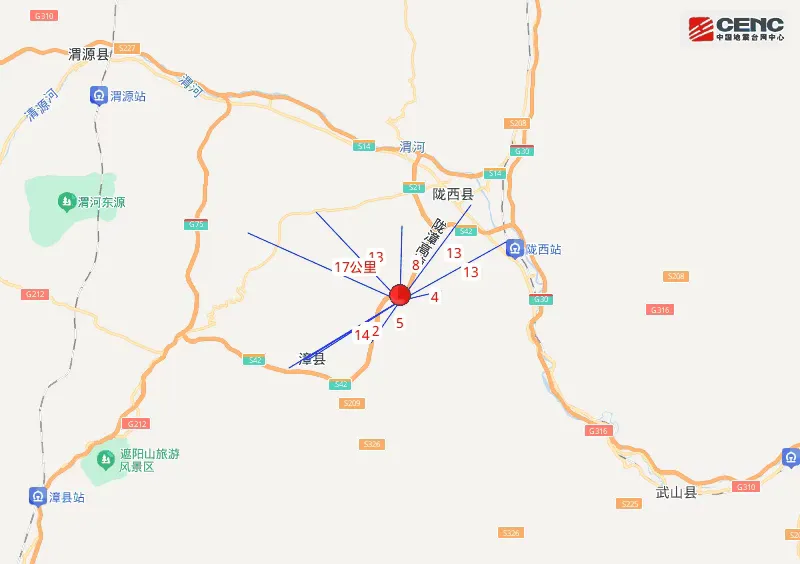 震中距漳县12公里、距陇西县12公里、距武山县35公里、距渭源县42公里、距通渭县69公里,距定西市78公里,距兰州市145公里,周边多地均有震感。
