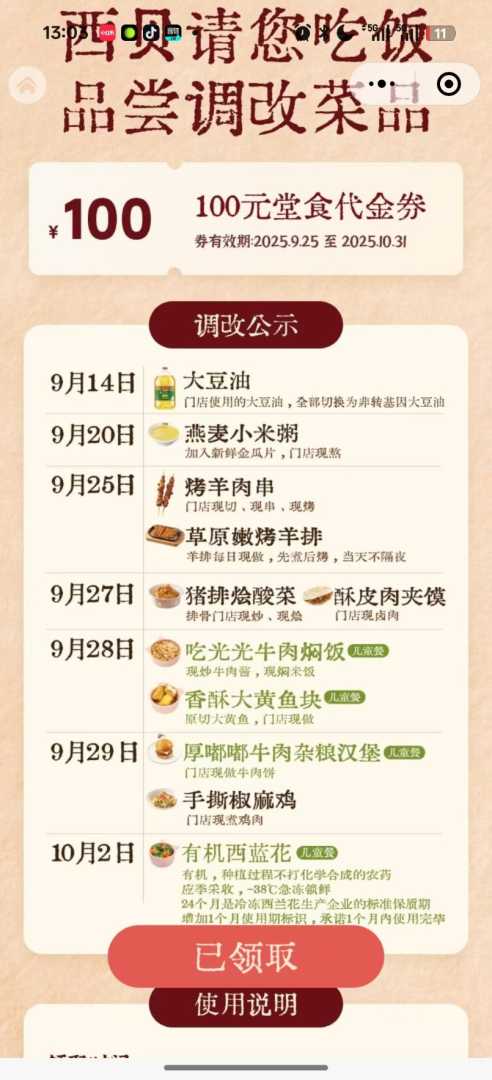 值得一提的是,代金券上有一份调改公示。该公示显示,10月2日之后,此前备受消费者关注的有机西蓝花会增加“一个月的使用期标识”,并承诺一个月内使用完毕。“之前虽然保质期是2年,但一般我们也会在1-2个月内使用完,现在缩短到1个月。”店员表示,这进一步体现了西贝对食材新鲜的追求。