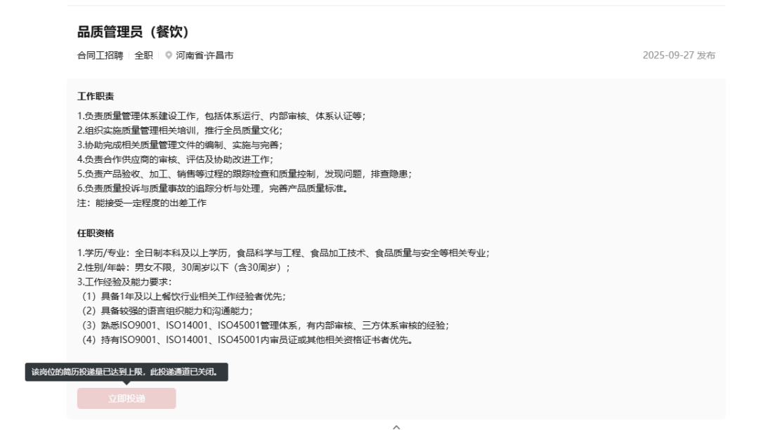 9月27日许昌胖东来招聘官网开启面试投递,多个职位因简历投递量上限关闭通道,还有部分职位可投递,9月24日曾公布42个岗位招155人。