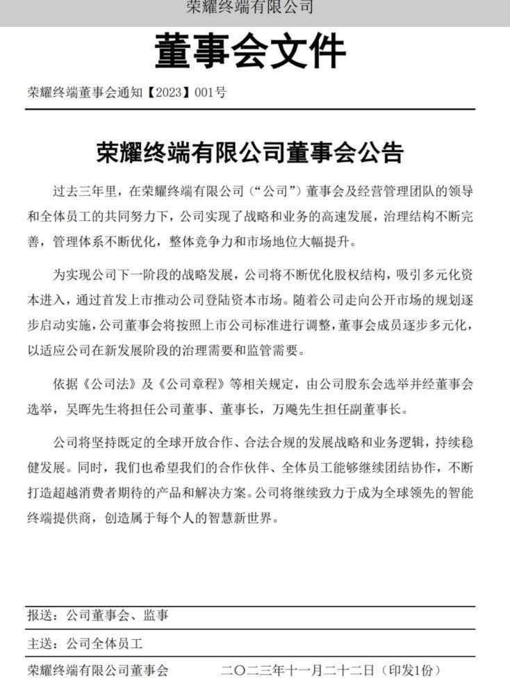 近两日,有关荣耀董事长换人及借壳上市的传闻甚嚣尘上。11月22日,证券时报记者获得并确认了荣耀内部文件的真实性。