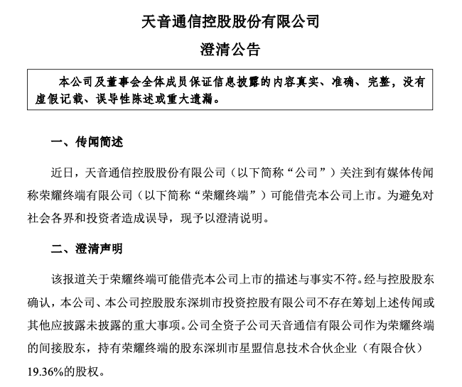 荣耀否认借壳上市,确认董事长换人,将独立上市