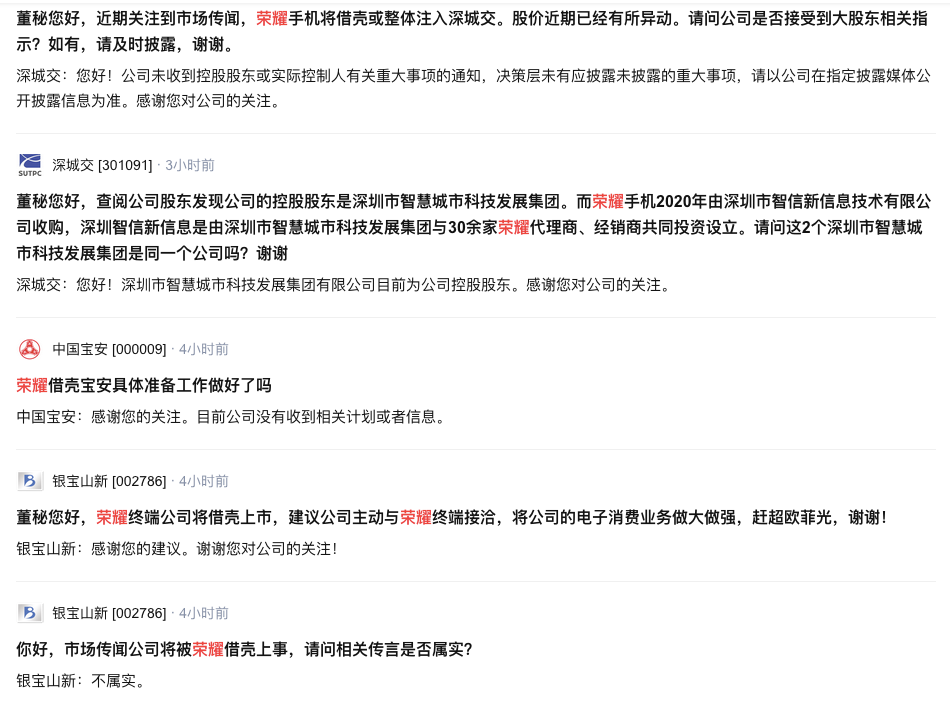 然而,随着相关上市公司的澄清和荣耀本身的辟谣,这些涨停个股的未来走向变得扑朔迷离。天音控股、深纺织等公司已澄清与荣耀借壳上市无关,深城交、中国宝安、银宝山新等公司也对借壳传闻予以否认。