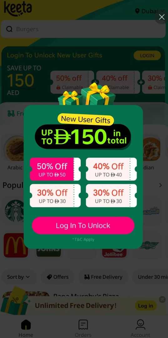 在上线初期,新用户注册Keeta还可以获得半价、六折优惠券,据Keeta宣传页面,最高优惠可达150迪拉姆(约合291.34元人民币),促销活动吸引用户关注。