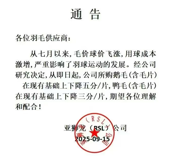 张强提供了一份知名羽毛球品牌亚狮龙(RSL)公司的《通告》,该《通告》发布于2025年9月15日,要求降低羽毛收购价格。其中提到: “自7月以来,毛价、球价飞涨,用球成本激增,严重影响羽球运动发展。从即日起,公司所购鹅毛(含毛片)在现有基础上每片下降5分,鸭毛(含毛片)在现有基础上每片下降3分。”