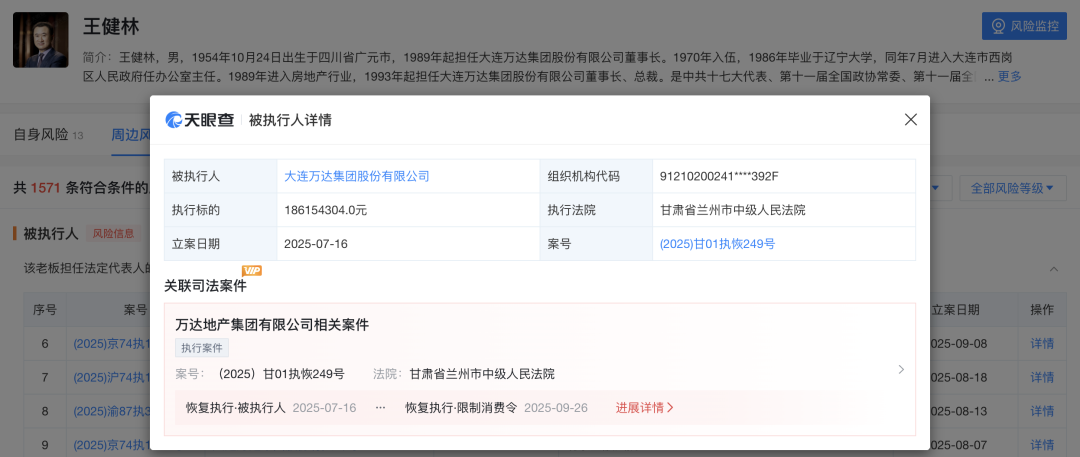 红星资本局9月28日消息,据天眼查,近日,大连万达集团股份有限公司及其法定代表人王健林等被限制高消费,这一商业风波(关键词1)引发了广泛关注。据天眼查,相关案件执行标的为1.86亿元,执行法院为甘肃省兰州市中级人民法院。进展详情显示,9月26日,王健林等人被限制高消费。