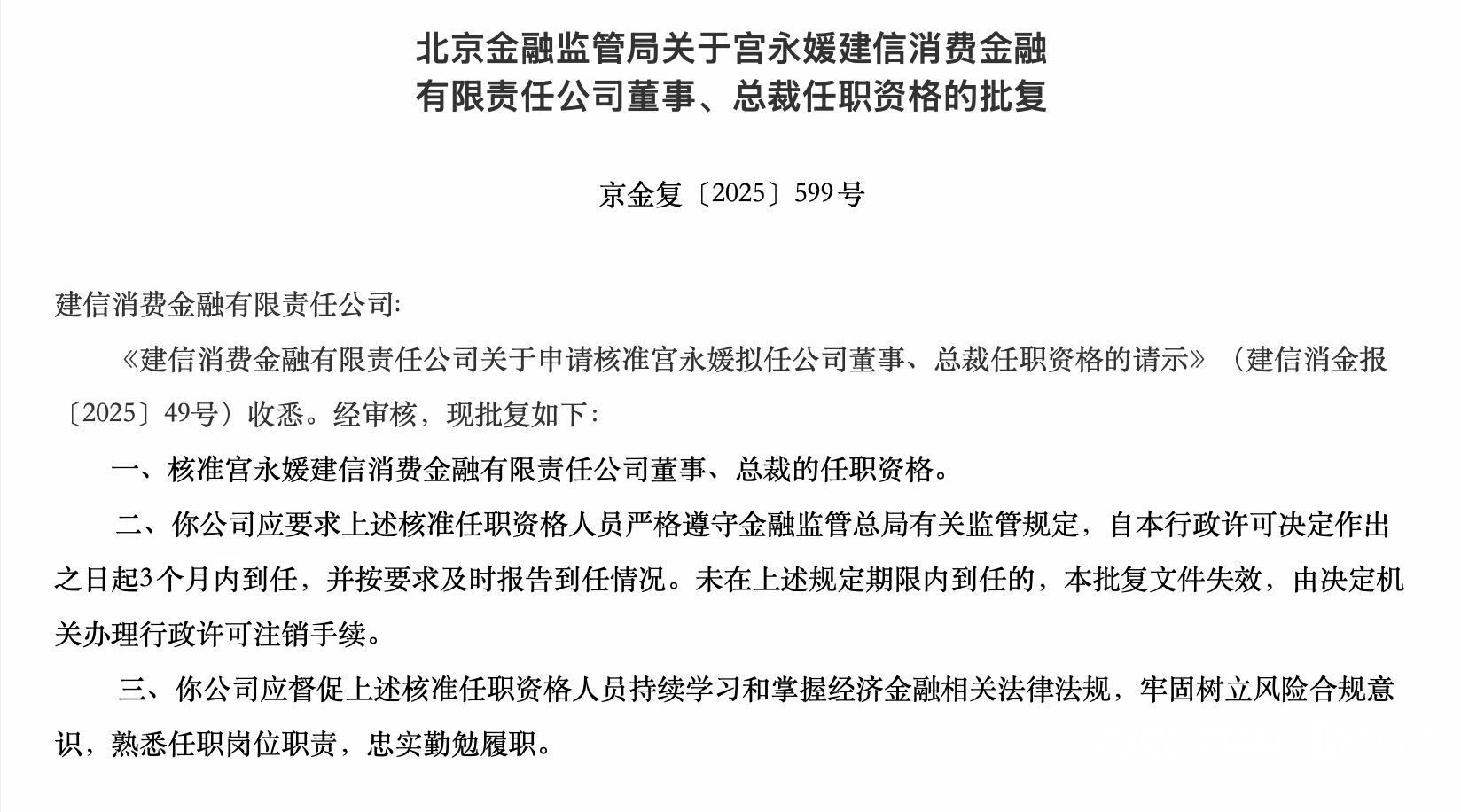 北京金融监管局发出的批复指出,核准宫永媛建信消费金融有限责任公司董事、总裁的任职资格。