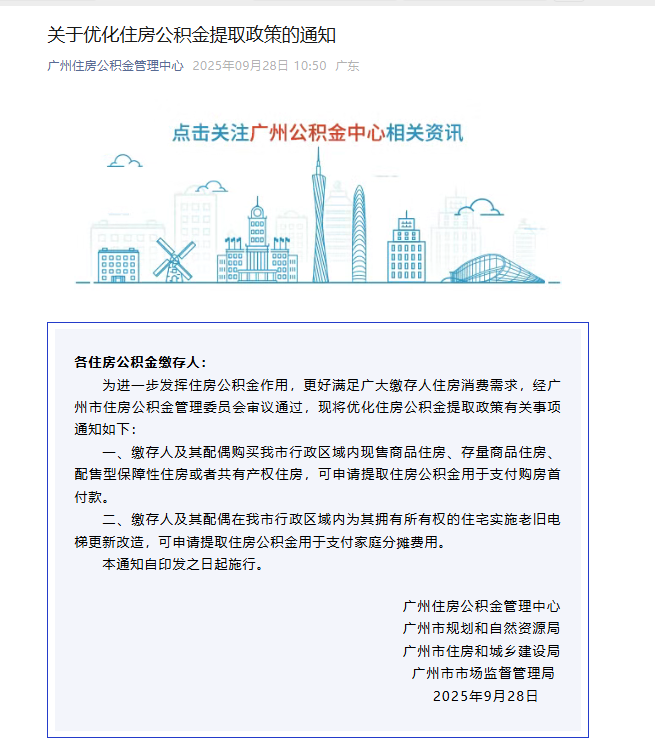 广州住房公积金管理中心等四部门发布通知,缴存人及其配偶购买广州行政区域内住房可提取公积金付首付款,实施住宅老旧电梯更新改造也可提取公积金支付分摊费用。