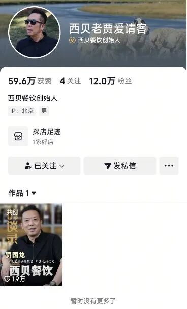 9月28日,西贝创始人贾国龙的小红书账号、视频号账号“西贝老贾爱请客”内容已清空。其抖音账号目前仅保留一条公开视频作品,发布于2024年9月30日,该视频与其他博主共创,涉及西贝的成长史。作为知名餐饮品牌,西贝的这一系列社交媒体动态引发了广泛关注。