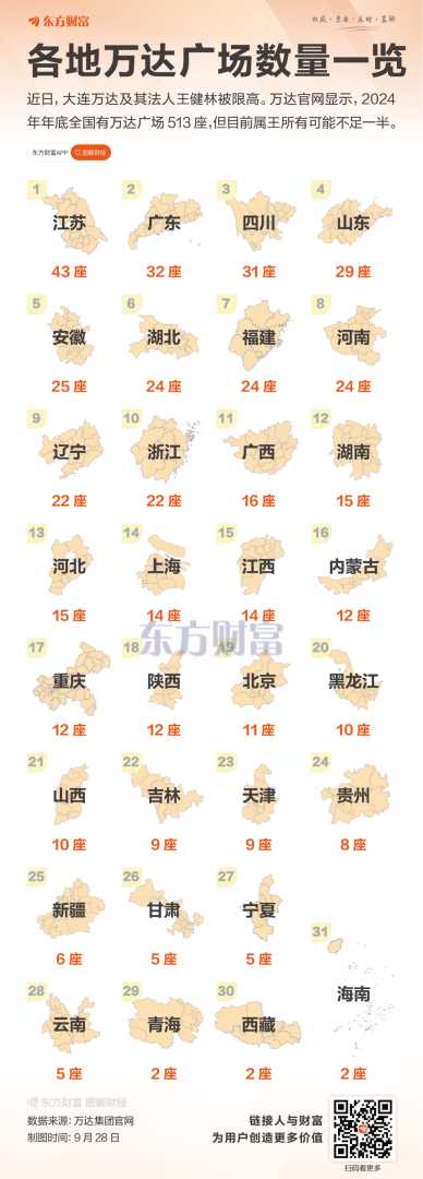 珠海万达商业管理集团(下称珠海万达,大连万达控股78.83%)官网显示,截至2024年12月31日,其运营管理万达广场513家,商业运营总建筑面积7,079万平方米,遍布全国31个省份及合计228个城市。数据显示,拥有万达广场数量最多的前三个省份是江苏、广东和四川,分别有43座、32座和31座,这些地区商业地产繁荣可见一斑。拥有万达广场最少的是青海、西藏和海南,均有2座。