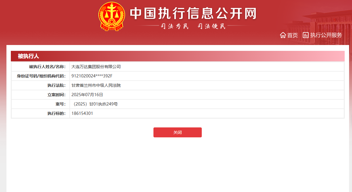 红星资本局通过天眼查App查询发现,相关案件执行标的为1.86亿元,执行法院为甘肃省兰州市中级人民法院,发布时期为9月26日,被执行人涉及武汉万达文旅置业有限公司、武汉楚河汉街文化旅游投资有限公司、大连万达集团股份有限公司、万达地产集团有限公司。