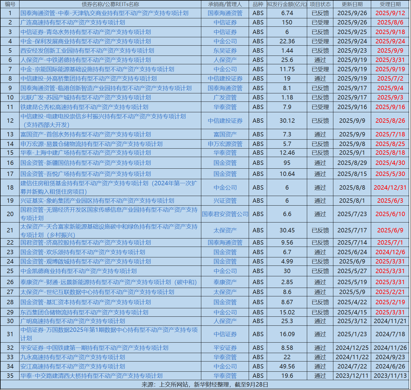 据新华财经梳理,今年以来持有型不动产ABS市场发展突飞猛进。截至2025年9月28日,上交所持有型不动产ABS挂网产品共计35只、697.86亿元,其中有29只产品为年内接受受理,此前2024年仅有5只产品、2023年仅有1只产品逐步受理、反馈和通过。