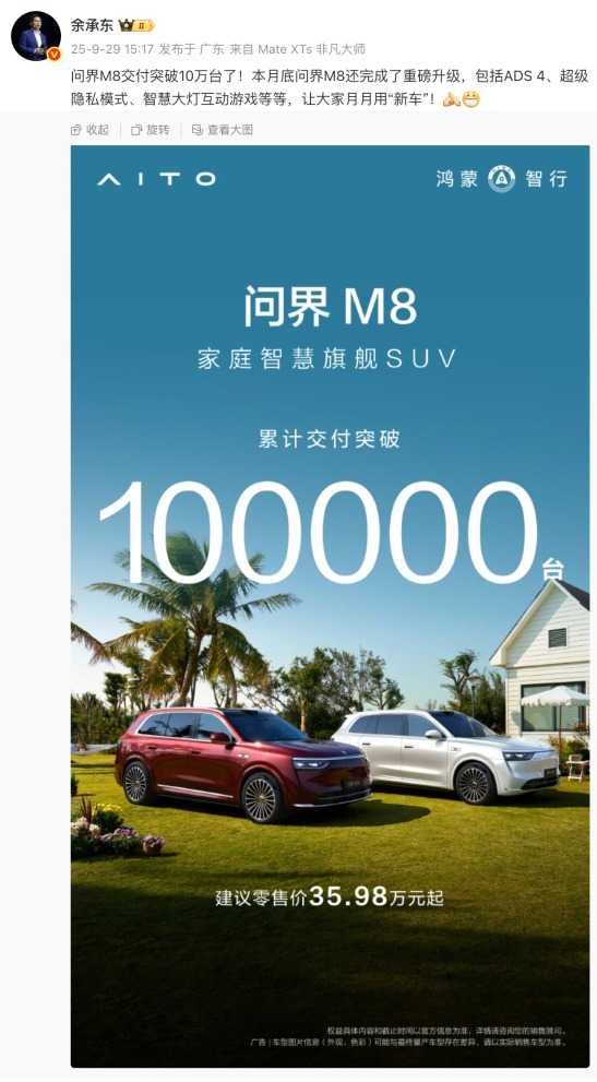 9月29日下午,余承东发文透露问界M8累计交付突破10万台,彰显了其在新能源汽车市场的强劲竞争力,成为消费者购车首选之一。