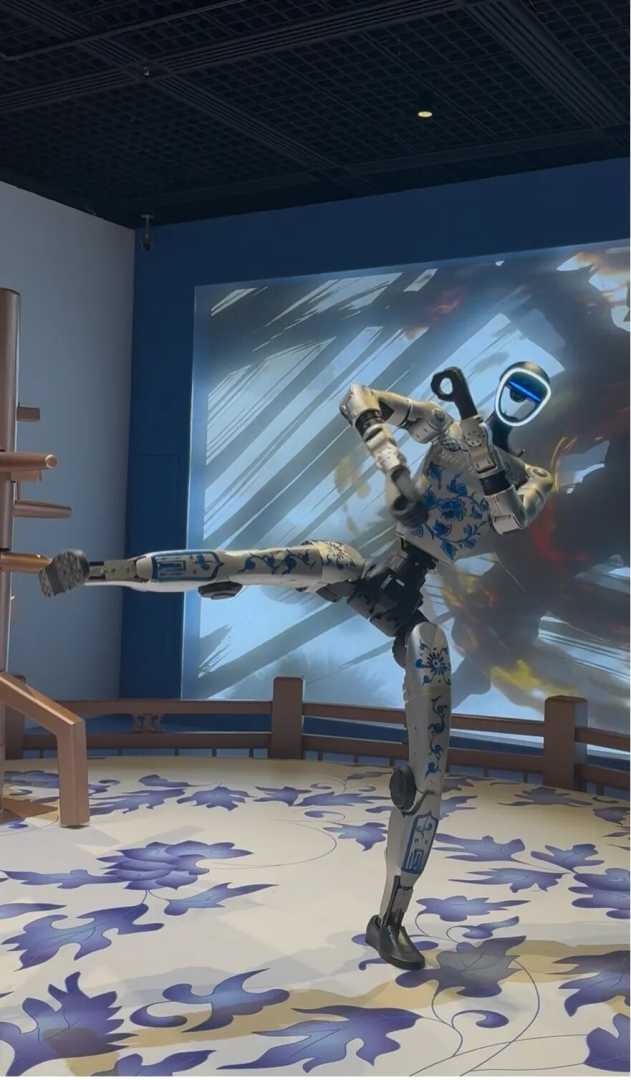 “我右拳打开了天化身为龙,把山河重新移动填平裂缝……”伴随周杰伦歌曲《龙拳》响起,一台身涂青花纹饰的人形机器人拳臂生风,一套咏春拳打得刚猛凌厉。