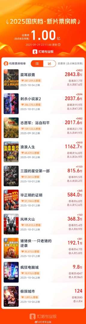 截至9月29日22时11分,2025年国庆档新片预售总票房已突破1亿元。《震耳欲聋》《刺杀小说家2》《志愿军:浴血和平》暂列预售票房榜前三,电影市场国庆档热潮涌动。